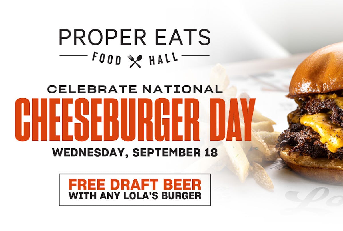Lola’s Burgers is located within the bustling Proper Eats Food Hall, known for its vibrant atmosphere and diverse food offerings. Whether you're a local or just passing through, this is the place to be on National Cheeseburger Day.Find any Manager at Proper Bar to redeem your free draft beer offer.