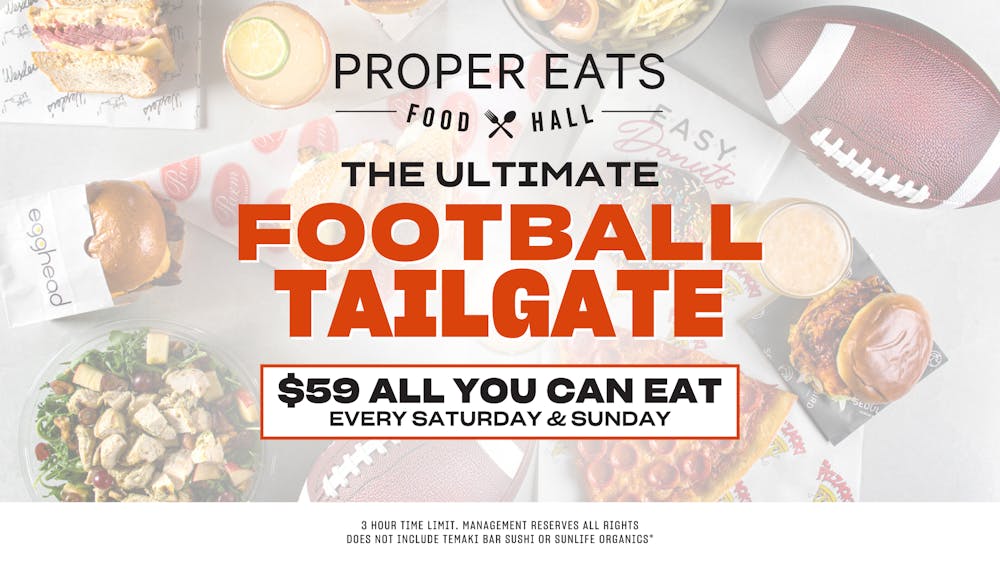 Kick off football season at Proper Eats Food Hall with the ultimate game-day experience. Every Saturday and Sunday, enjoy our $59 All You Can Eat Tailgate special, featuring endless eats from your favorite food stalls. Pile your plate high with game-day classics - from the best burger burger in town, crispy fried chicken, deli favorites, pasta, pizza, and more – all crafted fresh and made to share.